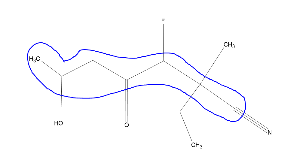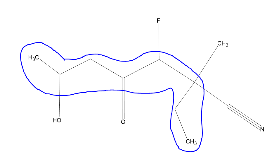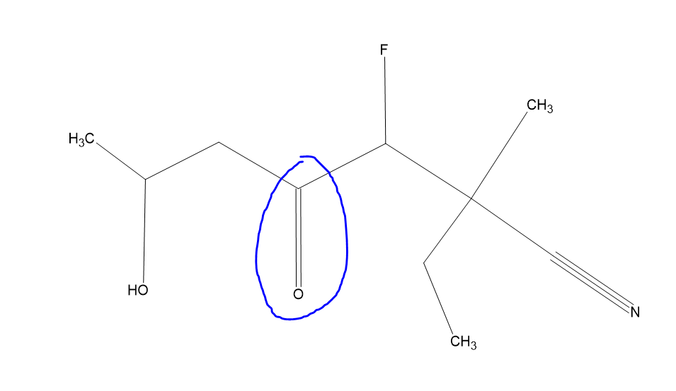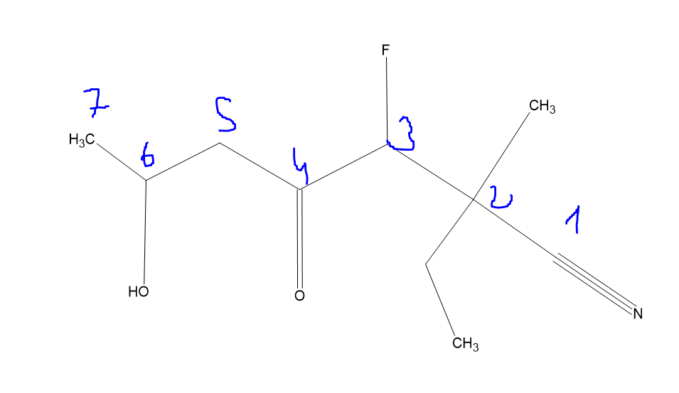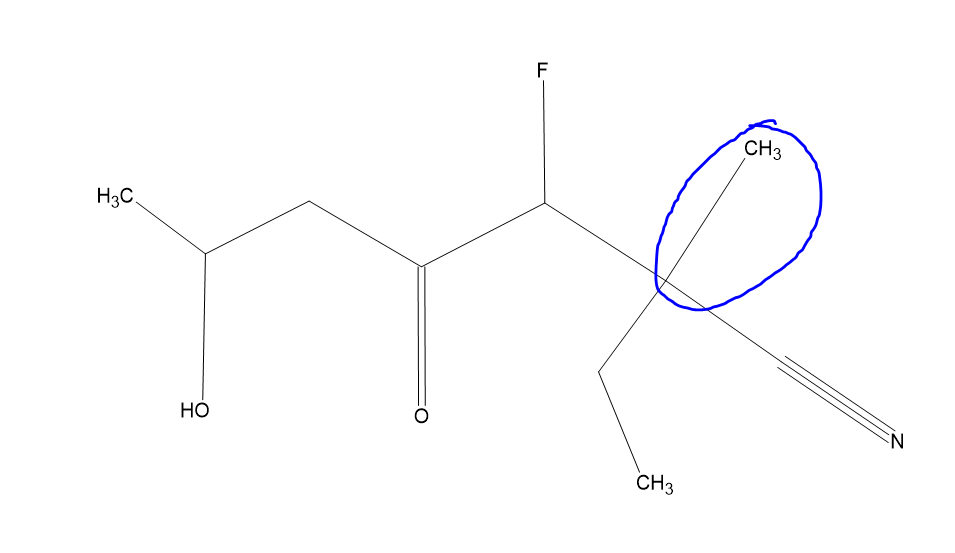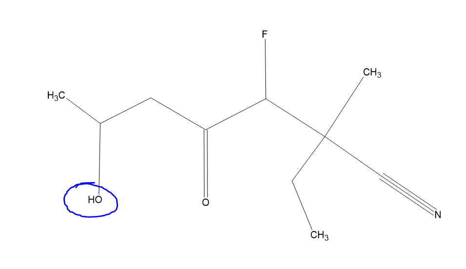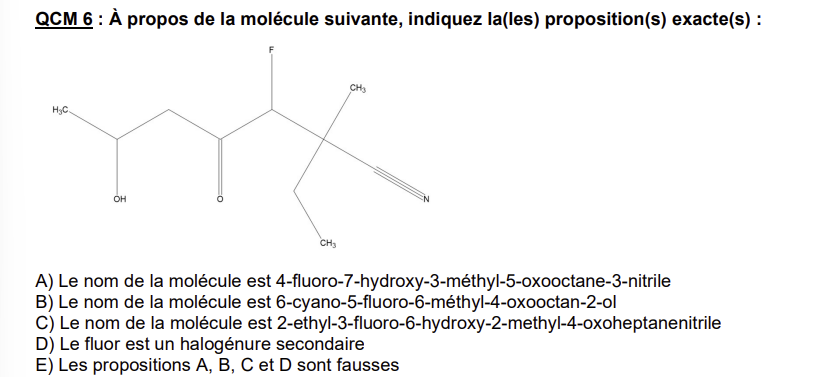 Donc pour finir on va avoir 2-éthyl-3-fluoro-6-hydroxy-2-méthyl-4-oxoheptane-1-nitrile, on peut d'ailleurs enlever le 1 ici on s'en fout ça donne donc 2-éthyl-3-fluoro-6-hydroxy-2-méthyl-4-oxoheptanenitrile