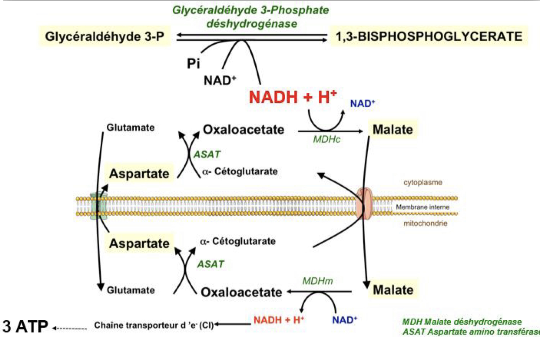 Voici le schéma que la prof présente dans le cours de la glycolyse avec la partie sur la navette Malate-aspartate :