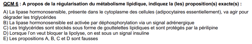 Dans l'item A, on dit que la lipase hormonosensible agit pour dégrader les TG. Mais elle ne s'occupe pas plutôt des DAG ?