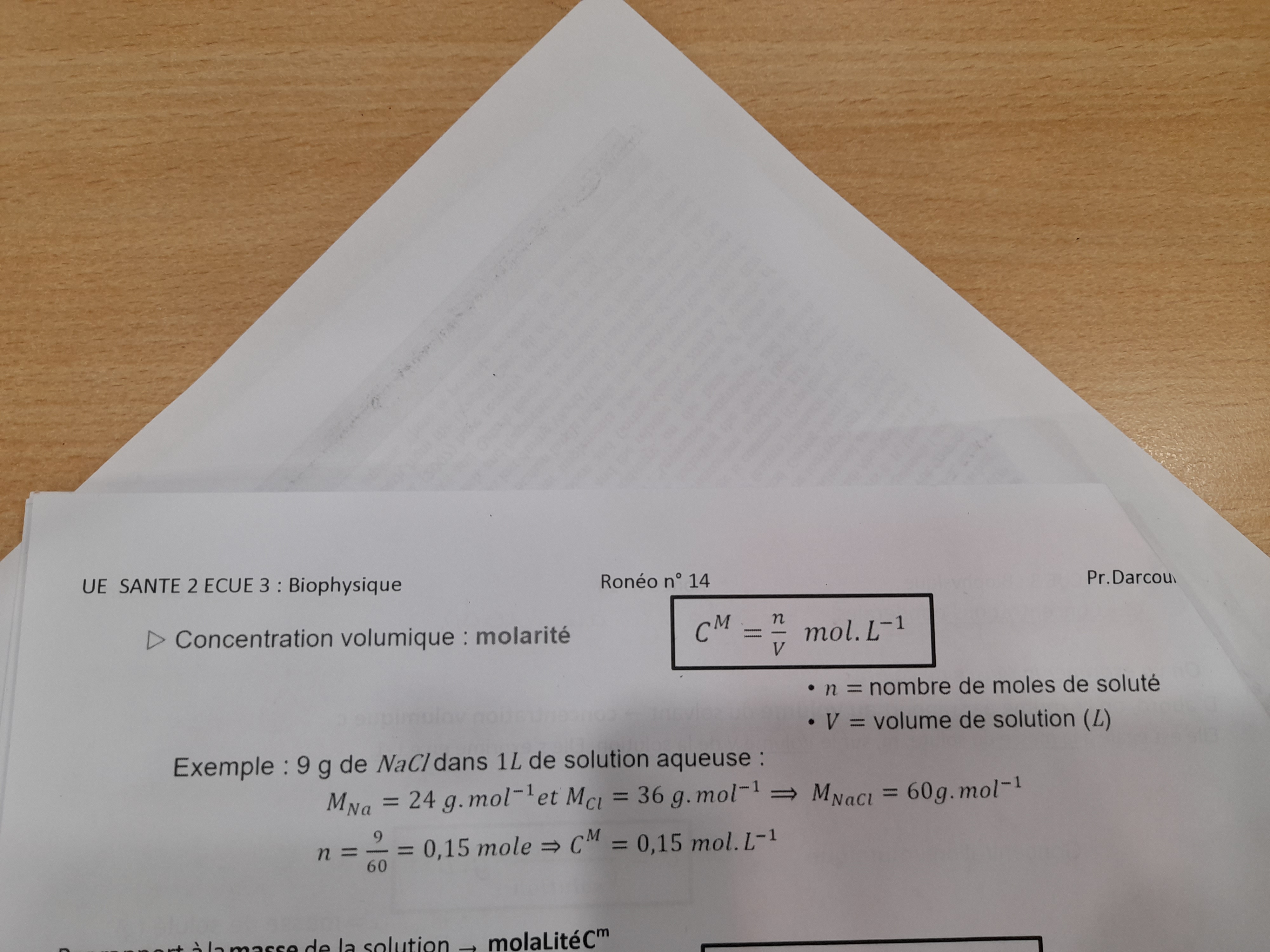 Et au lycée on t'a appris que pour calculer n il fallait diviser m par M. Donc, dans l'exo, où m=9 g et M=60 g/mol, on a alors, n = 9/60 = 0,15 mol. Sauf que, comme le volume est de 1L, la valeur reste la même mais l'unité change, puisqu'on divise 0,15 par 1, on a donc au final 0,15 mol/L.
