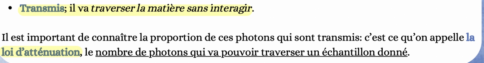 Effectivement la loi d’atténuation permet de déterminer les photons transmis, mais le facteur le plus important qui permet de calculer ce nombre là c’est le nombre de photons atténués!