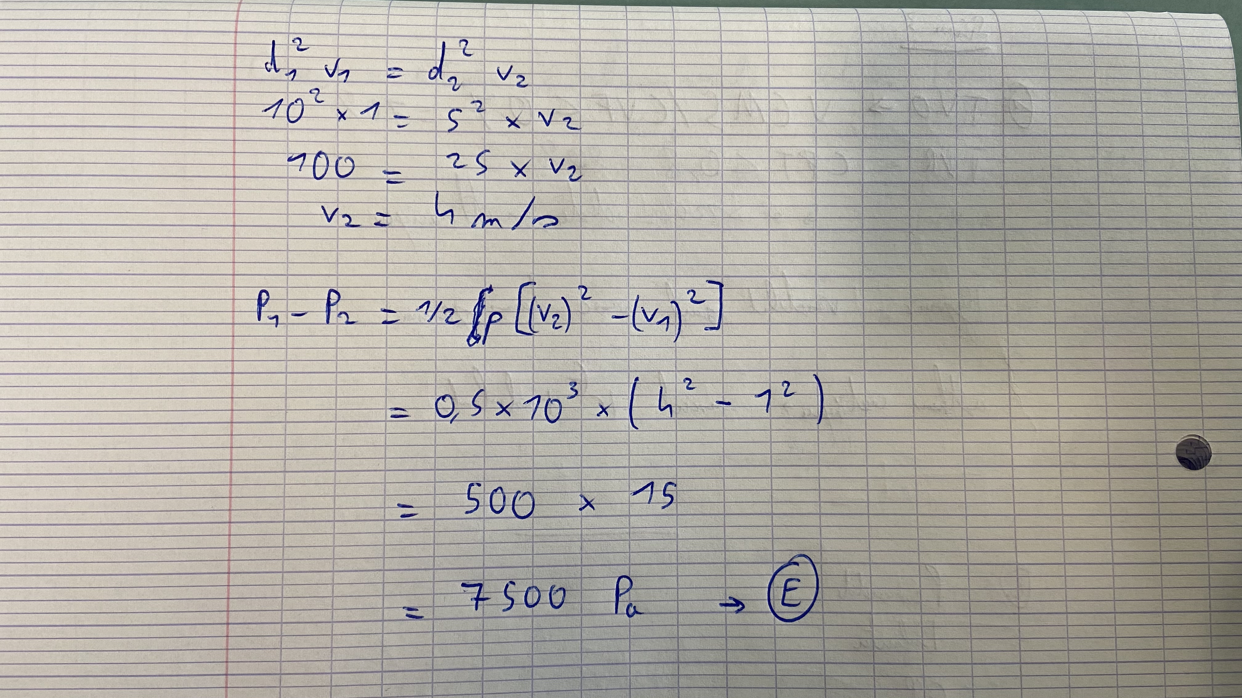 j’ai trouvé que v2 = 2m/s dû au principe de continuité du début (s1v1 = s2v2 )