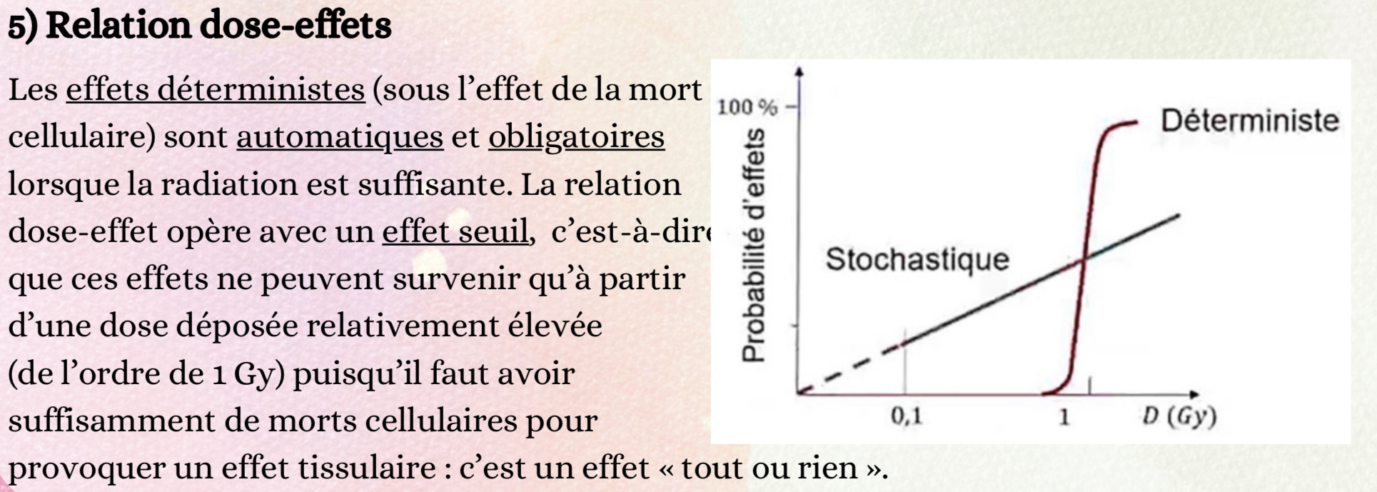 Je voudrais juste avoir la confirmation que l'item est bien à compter comme il est inscrit dans la correction. J'ai un petit doute car la définition colle plus avec celle des risques stochastiques. Mais dans l'absolu ce n'est pas non plus faux de dire que les risques déterministes se situent au-dessus de 100 mGy, puisqu'on les retrouve à partir de 1Gy.