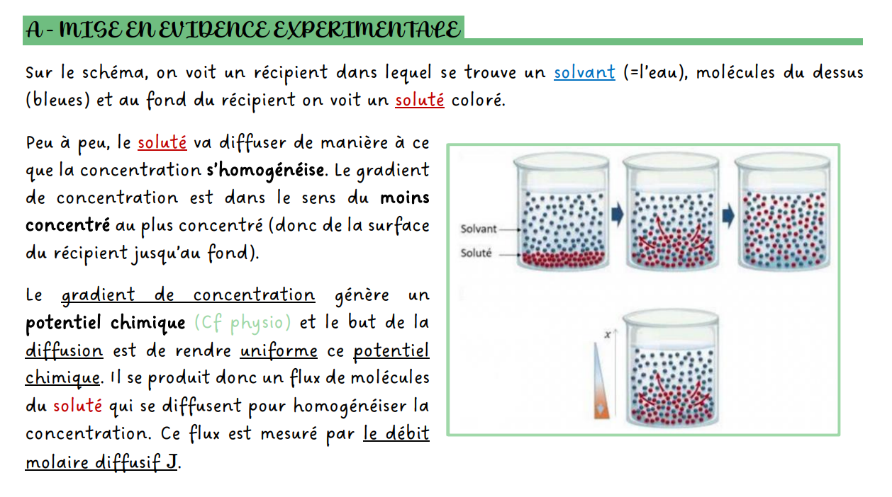"dans un récipient dans lequel se trouve de l'eau et un soluté au fond, ce dernier aura tendance à diffuser de manière à homogénéiser la concentration"