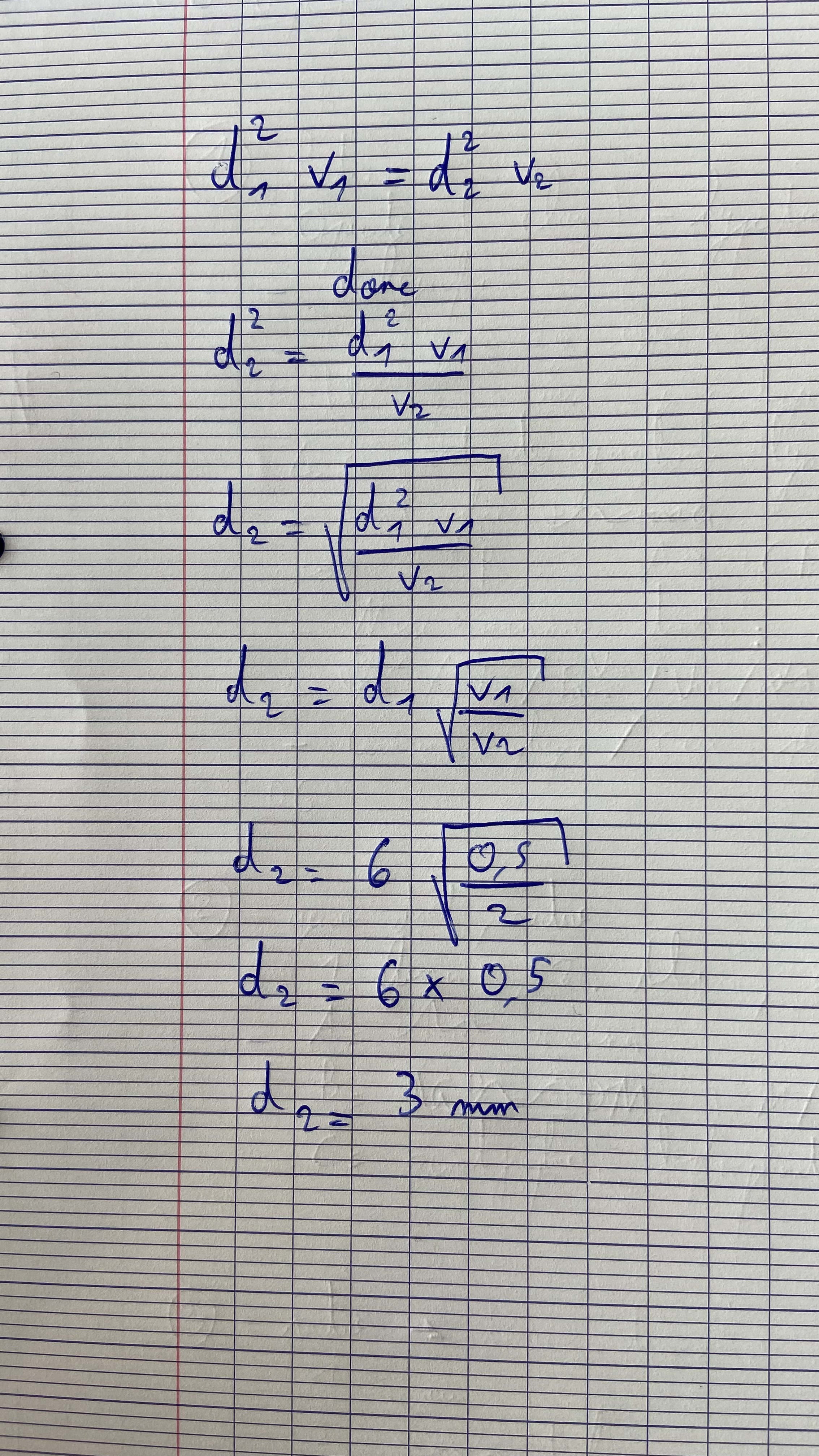 Je ne comprends pas pourquoi les diamètres sont au carré et quand j’essaye de refaire le calcul je n’arrive pas à retrouver le même résultat que dans la correction..