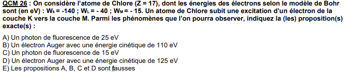 Je fais face à une incompréhension concernant le QCM 26 du DM pré-EB 1. Il est indiqué dans la correction que les items C et D sont justes, car les résultats sont possibles si un électron vient de l'extérieur jusqu'aux couches en question. Mais, ce n'est pas lors d'une ionisation que des électrons peuvent venir de l'extérieur ? Il me semblait avoir compris que ceci ne s'appliquait pas à l'excitation.