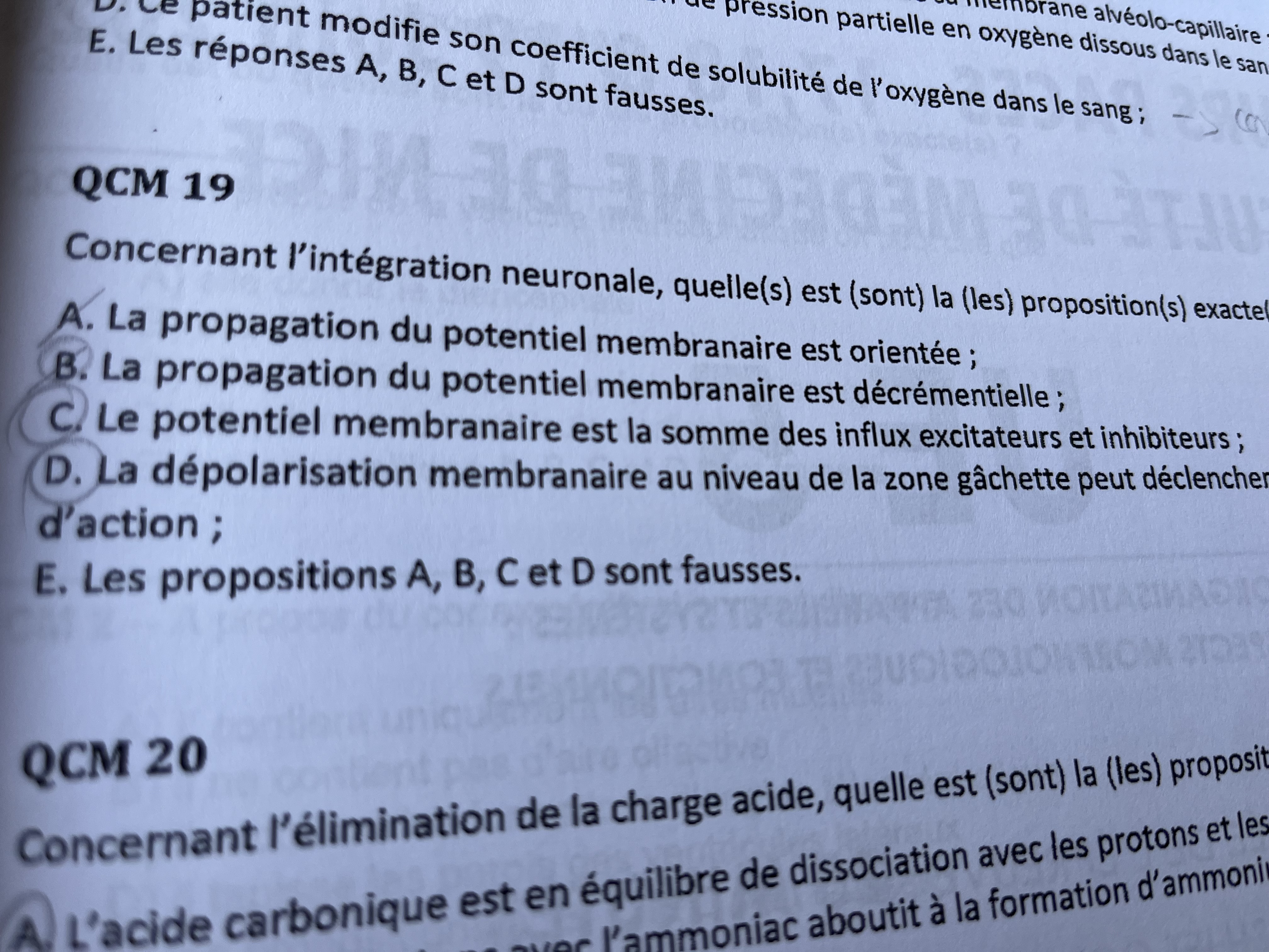 Il y a un petit souci dans les items non? Le fait de parler de potentiel membranaire en parlant de l’intégration neuronale il me semble ne jamais l’avoir vu écrit comme ceci non? Et la A est comptée fausse j’imagine que c’est parce que l’énoncé parle d’intégration mais dans la correction la justif c’est « propagation » alors qu’on parle bien de la propagation dans l’item….