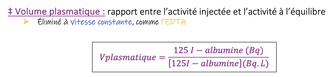 dans le cours, il y a écrit que le volume plasmatique se mesure en faisant le rapport entre l'activité injectée d'albumine sur l'activité à l'équilibre de l'albumine => donc on applique ici la formule concernant les traceurs séquestrés dans un compartiment
