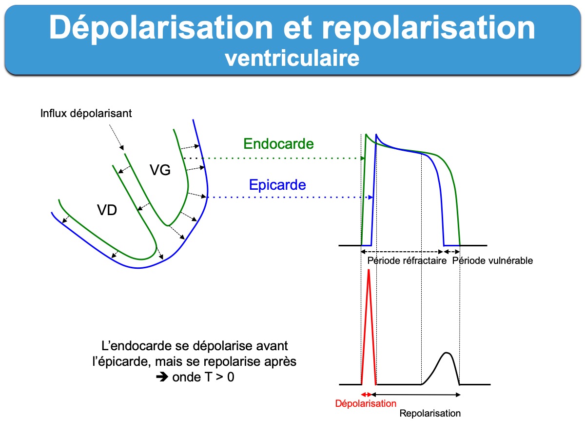 Endocarde (couche interne du cœur) : se dépolarise en premier mais se repolarise en dernier et inversement pour l’epicarde (couche externe du cœur)