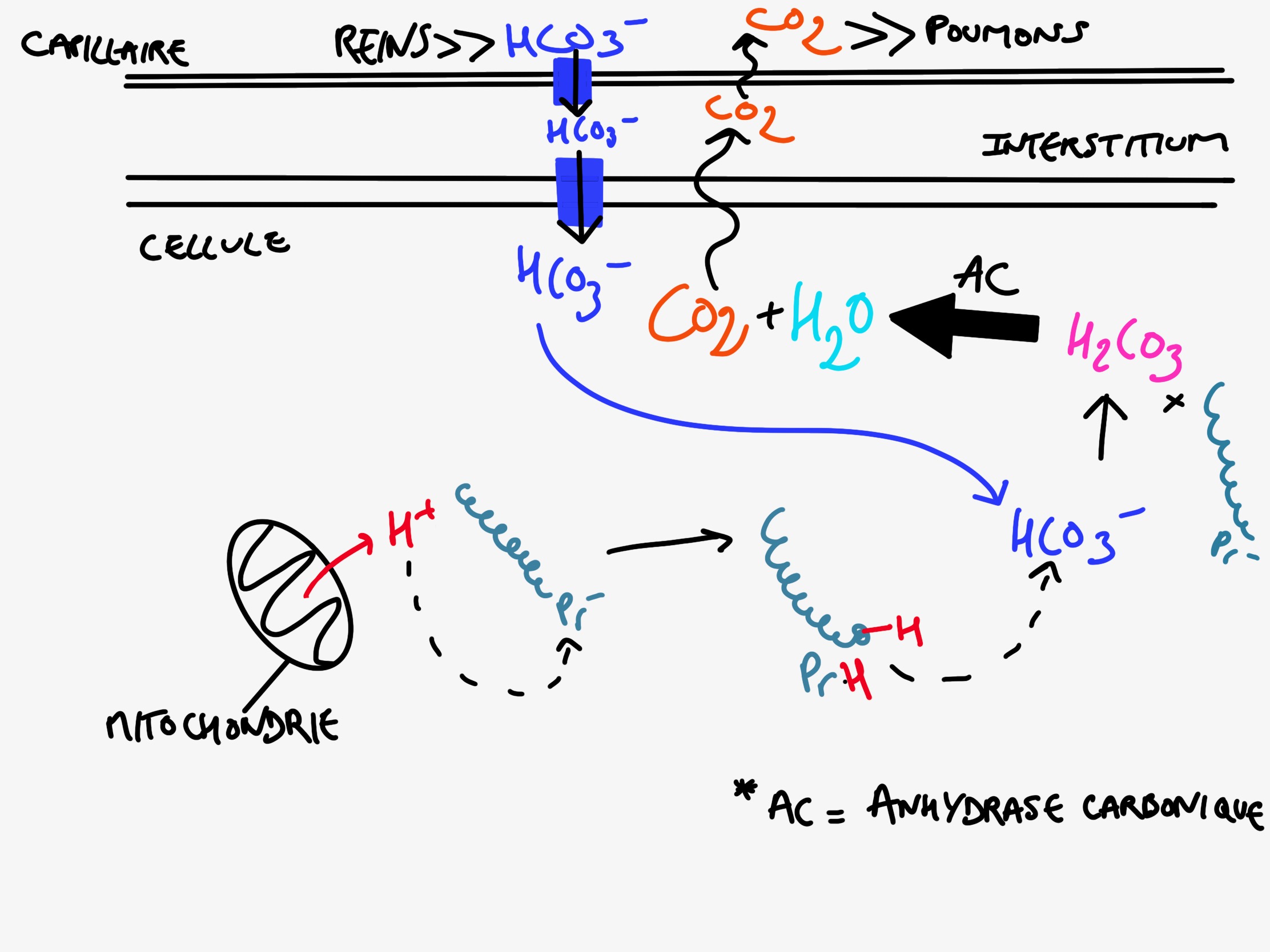En fait comme tu peux le voir sur mon schéma, les protons issus du métabolisme énergétique se retrouvent (in fine) tamponnés par des bicarbonates dans la cellule