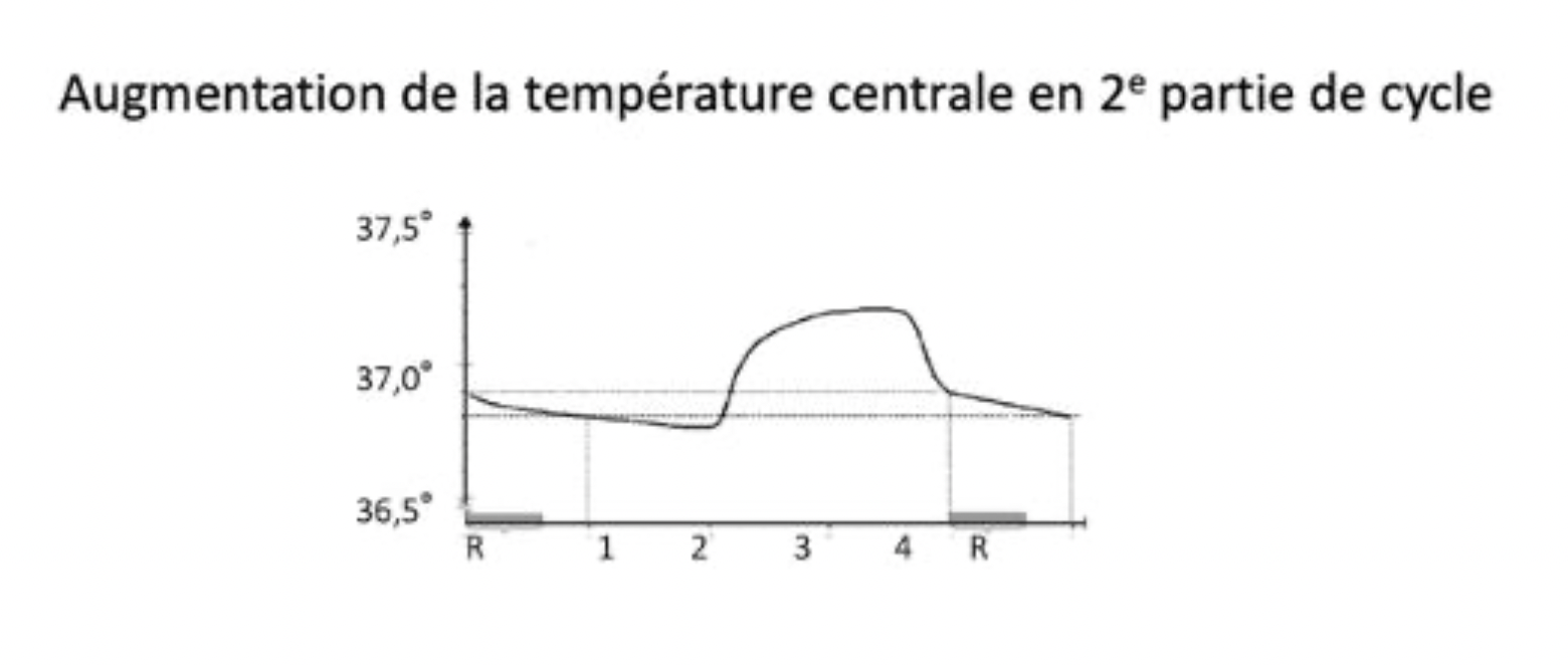 Ici pour le cycle menstruel tu vois bien qu'en 2e partie de cycle (semaines 3 et 4) la température centrale augmente