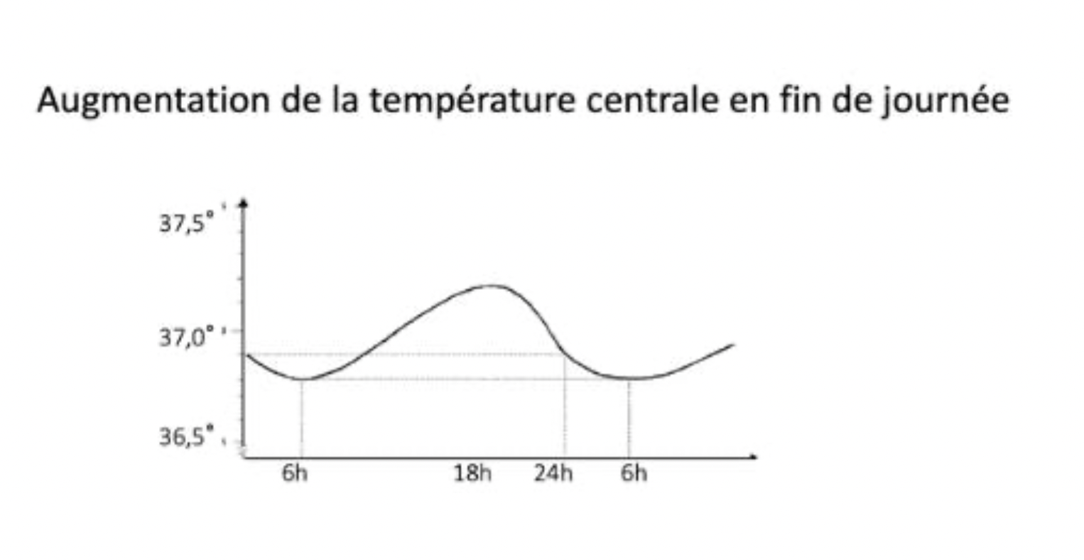 Et ici pour le cycle nycthéméral on voit que la température centrale commence à diminuer à partir de 18h pour atteindre son minimum vers 6h du matin