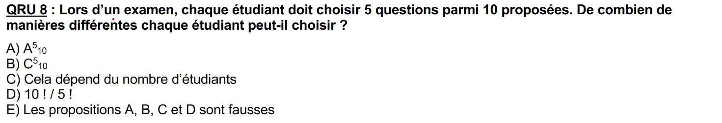 Désolée de te déranger mais j'ai du mal à comprendre pourquoi dans le qru 8 on utilise la formule des combinaisons de n éléments pris p à p parties d'un ensemble, et pas celle des arrangements de n éléments pris p à p.......