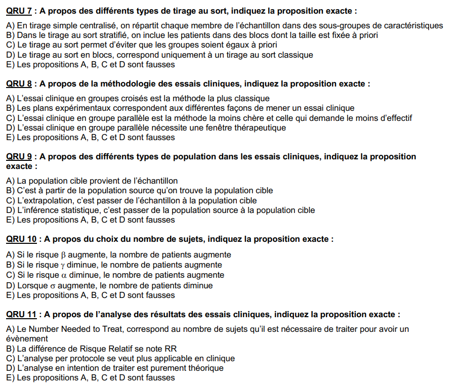 QRU 8 : la B j'ai pas trop compris, le prof parle de "schéma expérimental" et c'est pas vraiment les différentes manières de mener un essai clinique mais bien toutes les étapes qui mènent à mener un essai clinique (de phase III donc) et même après (phase IV).