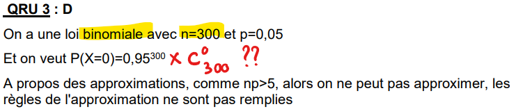 D. les valeurs n=300 et p=0,05 ne permettent pas une approximation par la loi de Poisson