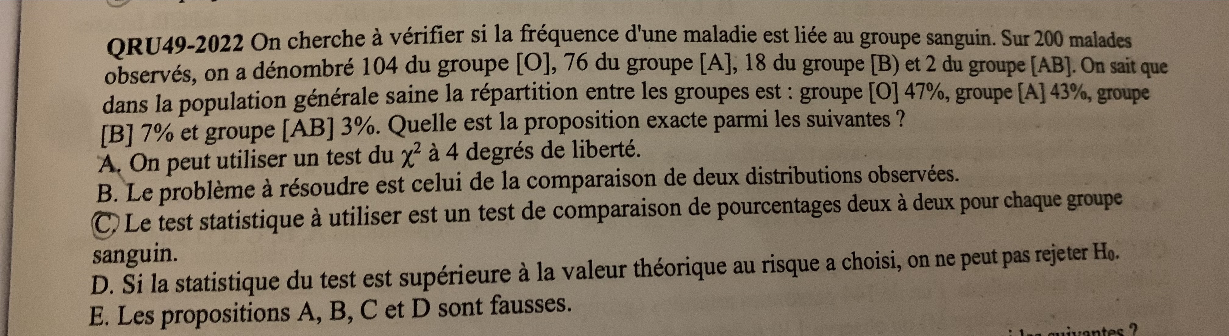 Enfin bref tu l'auras compris, le prof est absolument pas sympa en mettant ce qru, car il ne donne par d'exemple similaire pour s’entraîner ni tous les outils pour savoir quel test utiliser (de ce que j'ai vu sur internet, quand il y a une histoire de groupe sanguin et de proportion de maladie on est plutôt sur du X2 mais pas moyen d'être sûr)