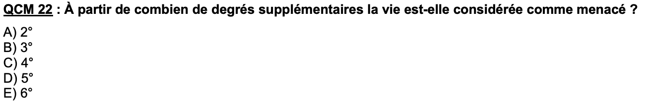 Du coup mon mon raisonnement pour répondre à ce QCM est dans le fait que si on choisit la réponse A qui est à partir de 2° cela englobe les autres réponses car elles ont une température supérieur à 2°. Ainsi je ne comprends pas pourquoi la réponse E est compté juste car si c'est à partir de 6° supplémentaires que la vie est considérée menacée alors pour moi il ne fallait pas choisir la réponse A qui correspond à une température inférieur.