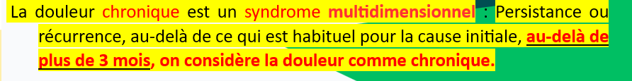 L'item B du QCM 14 dit que "la douleur est qualifiée de chronique au-delà de 3 mois", et celui-ci est compté faux. En effet, il y a d'autres facteurs à prendre en compte pour des douleurs chroniques.