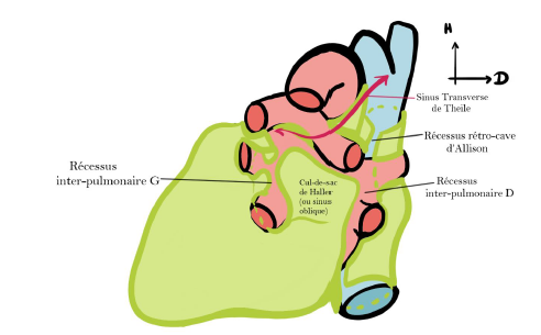 En fait le mésocarde c'est la partie du cœur qui n'est pas recouverte de péricarde. Il va donc s'agir des différents récessus présentés dans le cours.