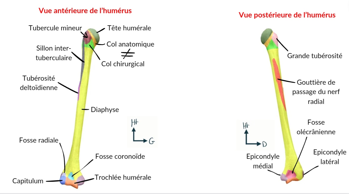 Sur les schémas, on a la tubercule mineur en antérieur, est-ce que ça fait référence à la petite tubérosité ou c'est complètement autre chose ? Et si c'est la même chose, je ne suis pas sûre de comprendre la position du sillon intertuberculaire pars vers la partie distale de l'humérus plutôt que de partir en postérieur où se trouve la grande tubérosité