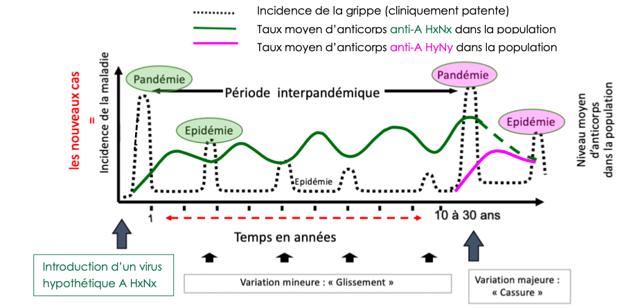 La courbe verte représente le tau d'anticorps moyen dans la population, au cours de chaque épidémie, ces taux d'anticorps diminuent = diminution de l'immunité croisée car le virus a légèrement changé.