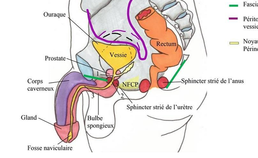Tandis que le sphincter strié de la vessie (= sphincter strié de l'urètre) se situe juste en dessous du bec de la prostate chez l'homme, et au niveau de la partie basse de l'urètre chez la femme.
