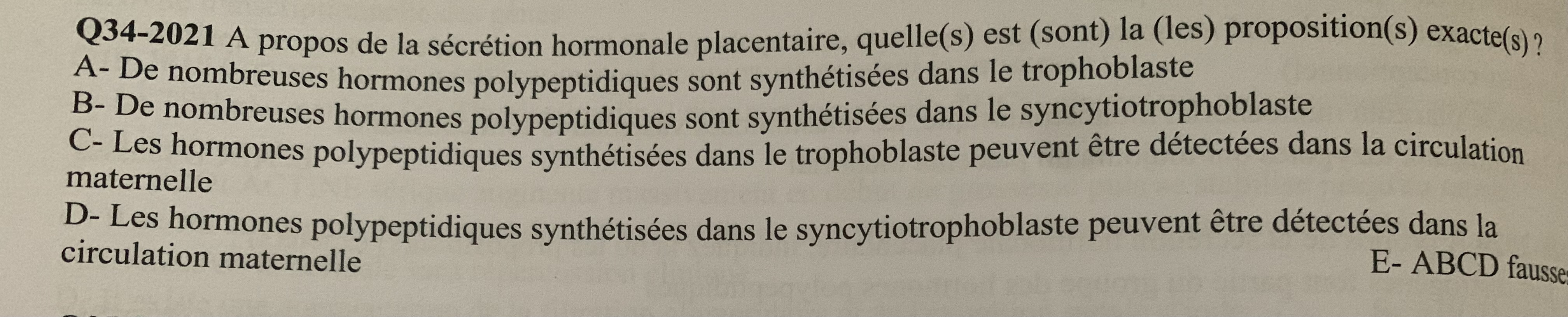 Sachant que dans le cours il est clairement dit que de nombreuse hormones polypeptidique sont synthétisées dans le trophoblaste, on peut affirmer que la A est juste et par déduction la C aussi. Du coup j'aurai dit ABCD, mais je voulais avoir une confirmation.