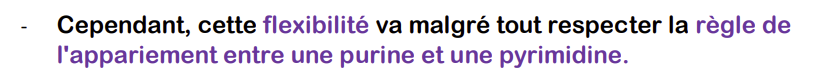 Dans le cours le prof ne précise pas si l'inosine est une purine ou une pyrimidine donc retient juste que le wobble respecte toujours la complémentarité purine et pyrimidine . Si tu veux je peux faire des recherches pour t'apporter plus de précisions mais je pense que ca risque surtout de t'embrouiller