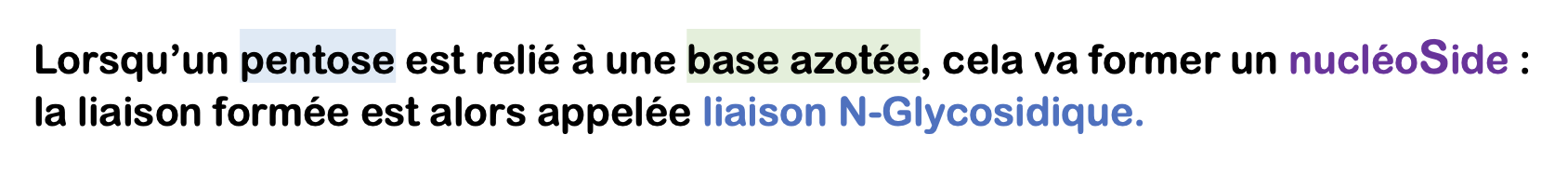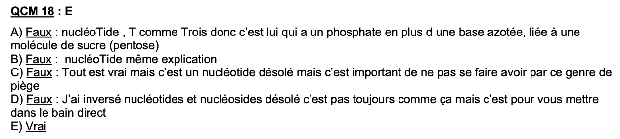 En effet, l'item A est "Lorsqu'un pentose est relié à une base azotée, cela forme un nucléoSide" et l'item C "..., la liaison formée sera alors appelée liaison N-glycosidique". Dans la correction fournie, les items A et C sont comptés comme faux ... or ils sont vrais d'après le cours ??? @@ (Je mets les captures d'écran).