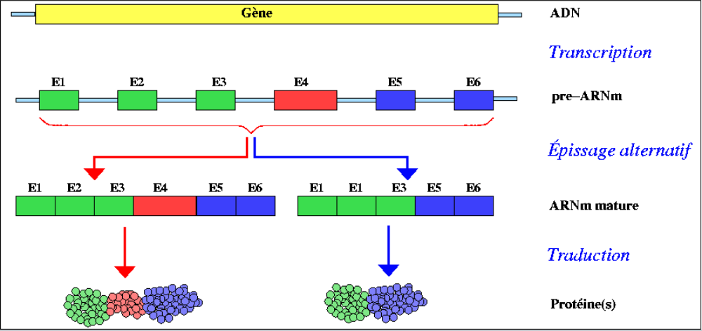 SAUF que nous produisons dans notre organisme, plus de protéines que de gènes. Cela signifie que plusieurs protéines proviennent d'un même gène. En réalité, il existe ce qu'on appelle, l'épissage alternatif qui correspond à un réarrangement des exons. On peut prendre tel ou tel exon et donc aboutir à plusieurs ARN messager matures différents. Ceci vont pouvoir alors être traduit en une diversité de protéines. C'est ce qu'on retrouve pour le