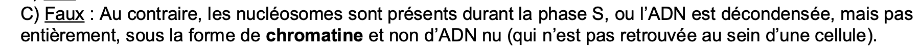 Concernant celui-ci il est faux car en effet ceux-ci sont présents pendant l'interphase et donc également pendant la réplication. Il faut imaginer que l'ADN n'est jamais sous forme d'ADN nu mais très souvent sous forme de fibre de chromatine de 11nm même quand les chromosomes sont décondensés. De plus il existe de l'hétérochromatine constitutive qui est présente peut importe la phase du cycle dans laquelle on se trouve ! Mais sinon en effet en phase de mitose les nucléosomes sont bien présent pour rendre l'ADN hypercondensé de sorte à la protéger pendant les différentes phases (Prophase, Métaphase, Anaphase, Télophase)