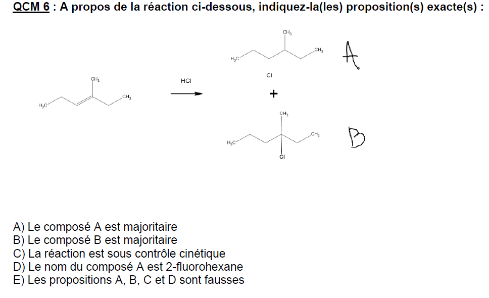je comprend pas pourquoi c est pas le composé B qui est majoritaire ? vu qu'on veut faire la reaction la plus stable donc on agit sur le carbone le plus subsitutué non ? je comprend pas non plus pourquoi la reponse D est juste alors qu'on a pas du tout de fluor ici ? ici on est sur une reaction d'addition ? je comprend pas pourquoi on est sous controle cinetique ?