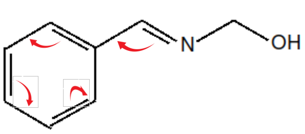 - On commence par repérer où est notre effet mésomère. On a plein d’enchaînements pi-sigma-pi qui font tout le cycle et qui vont jusqu'à l'azote. /!\Attention On ne délocalise pas le DNL de l'azote (il fait déja une double liaison) ! Notre effet mésomère va donc inclure l'azote mais pour délocaliser la double liaison qu'il fait.