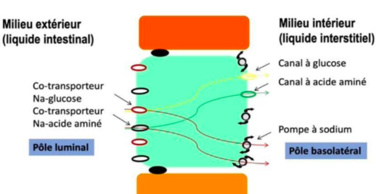 Prenons l'exemple du co-transporteur sodium/glucose au niveau des cellules épithéliales de l'intestin (cf cours flux transépithéliaux). Ce co-transporteur est présent au niveau de la face luminale de la cellule. Rappelle toi, au pôle basolatéral de ta cellule, t'as une pompe à sodium qui est en train de virer le sodium de la cellule. Il va donc y avoir un gradient de concentration du sodium (peu de sodium dans ta cellule, beaucoup dans la lumière intestinale). Le sodium va ainsi vouloir diffuser vers l'intérieur de ta cellule. Et grâce au co-transporteur sodium glucose, le sodium en rentrant va permettre de faire rentrer aussi du glucose avec lui (alors que le potentiel électro-chimique du glucose ne lui aurait jamais permis de rentrer sinon). Cet asservissement du transport du glucose à celui du sodium va permettre justement l'absorption des osmoles alimentaires.