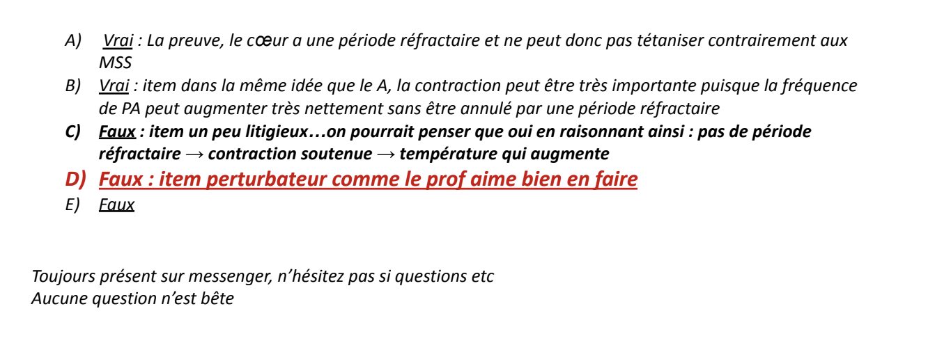 Mais l'item est faux car en effet l'augmentation de la température n'est pas directement liée à l'absence de période réfractaire. Elle est plutôt due à l'activité métabolique lors de contractions répétées.