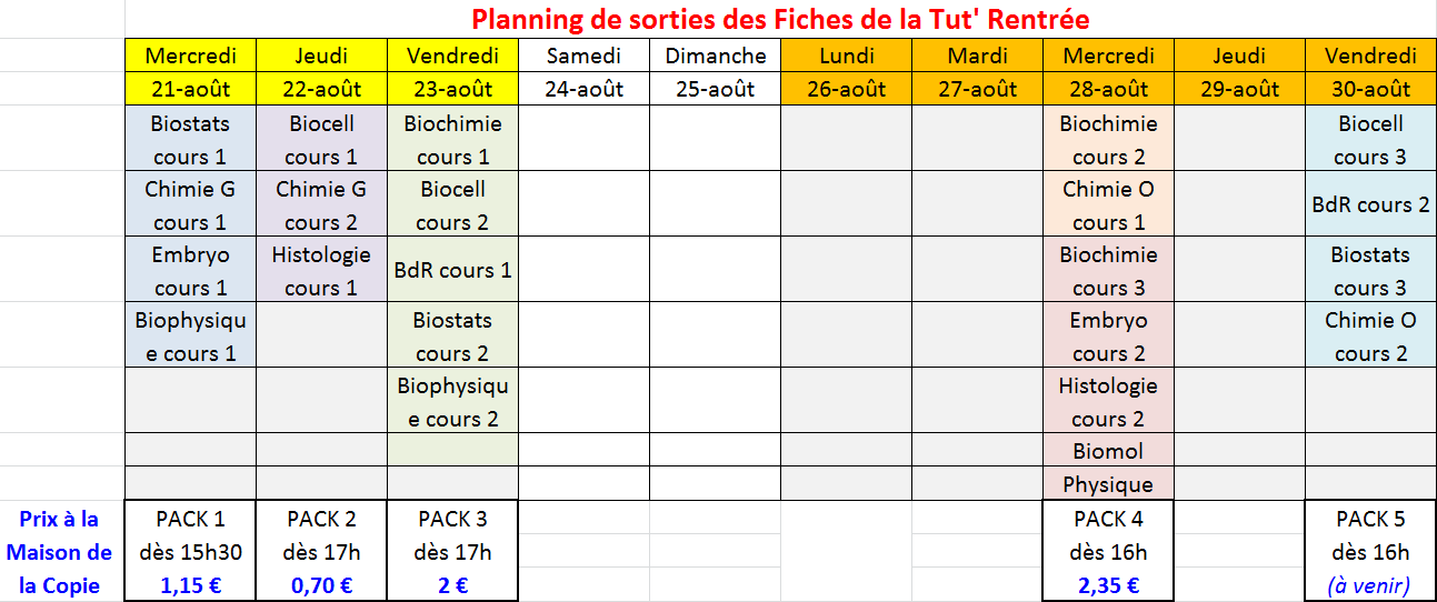 Voilà le planning de sortie des Fiches/diaporamas de cours pour toute la Tut' Rentrée sur le Forum et à l'imprimerie "Maison de la Copie" :
