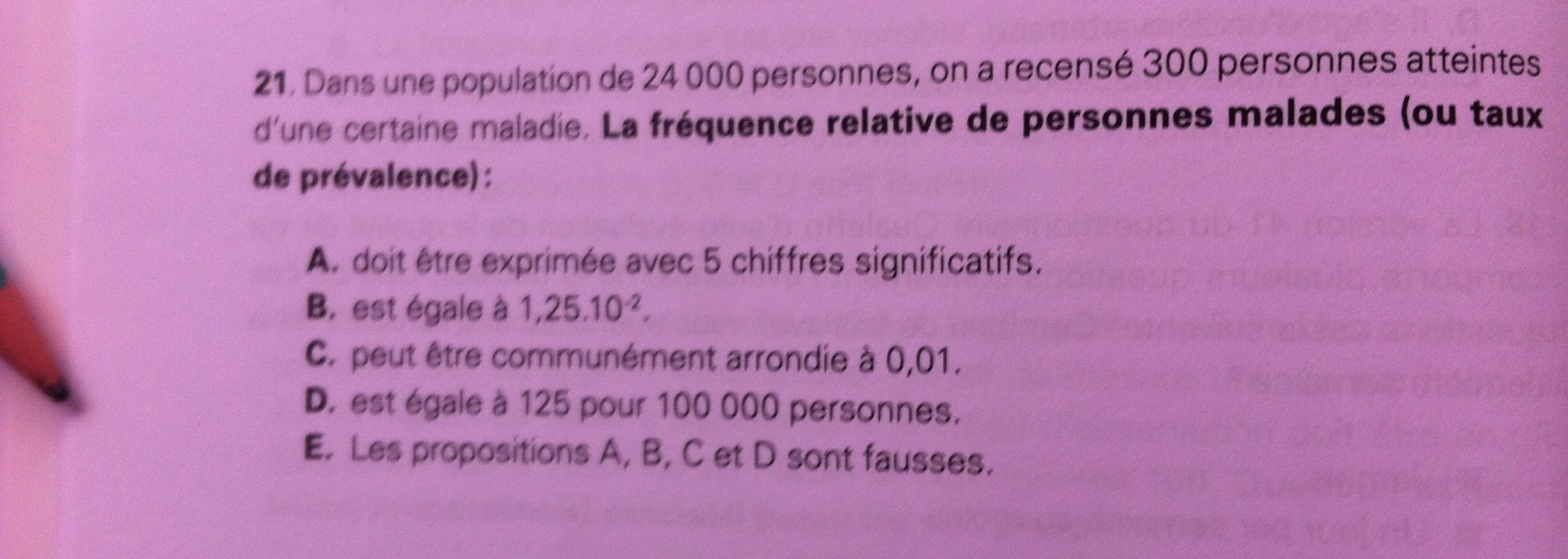 Le nombre de personnes malades sur 100 000 individus sera de 100 000 x 0,0125 = 105 x 1,25.10-2 = 1,25 x 103 = 1250 ( :arrow: D fausse).