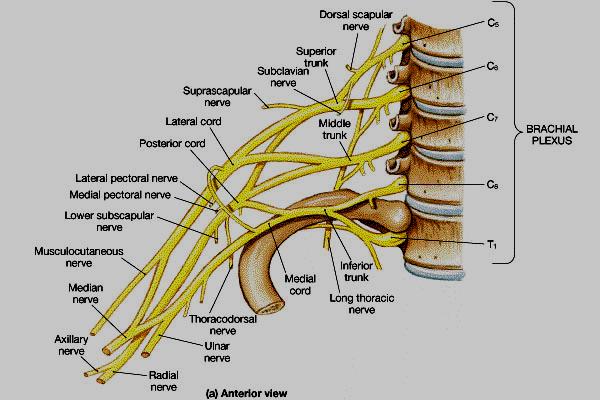 le nerf C7 qui sort entre les vertèbres C6/C7 le nerf C8 ( oui il y a bien un myelomere C8 mais pas de vertèbre correspondante puisque le nerf C1 sort entre C0/C1 , C0 étant la base du crane et non une vertèbre ) et donc le nerf T1 qui sort entre les vertèbres T1/T2 .