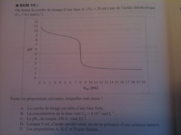 On aura une solution tampon à ce niveau uniquement si l'acide et la base sont non conjuguées :p. En y réfléchissant, je crois que le seul moyen d'orienter notre décision est qu'aucune information ne précise que l'acide chlorhydrique est l'acide conjuguée de la base faible titrée. Ou encore le fait que l'on note dans l'item le couple AH/A-...du coup, je sens que je suis bien grillé jusqu'au bout, parce que j'ai tort(enfin pas totalement, car l'idée d'un acide/base conjuguée n'était qu'une hypothèse