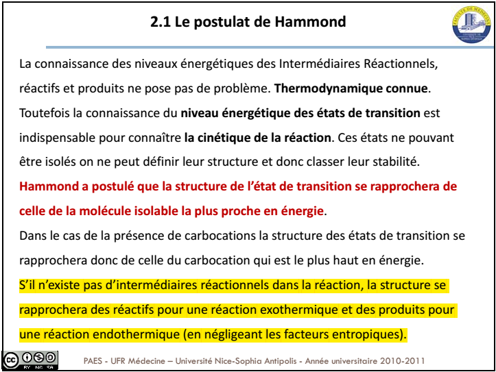 Guillaume.M a écrit:par conséquent 2 eme question , si j'ai bien compris le dernier du cours du prof le postulat de Hammond permet de comparer les états de transitions entre eux en les rapprochants de l'intermédiaire réactionnels le plus proche en énergie , mais du coup il ne s'applique pas dans le cas d'une SN2 puisqu'il n y a pas d'intermédiaire réactionnel ? ( pourtant on à quand même un état de transition mais bon.. ça me parait bizarre ! )