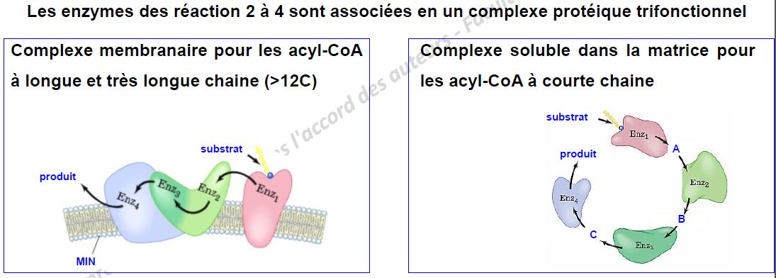Soit disant que les enzymes 2 à 4 de la béta-ox serait associées en un complexe tri-fonctionnel que ce soit pour les AG courts autant que les longs alors que cette image montre bien que ce n'est le cas que pour les AG longs ayant leurs enzymes de dégradation toutes ancrées dans la membrane construisant ainsi un tunnel réactionnel (vive l'enzymo)