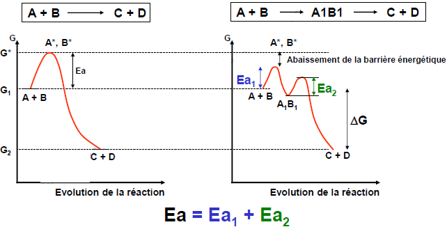 l'enzyme va former des intermédiaires réactionnels pour lesquels l'énergie d'activation à fournir sera plus basse: on va faire A+B -> A1+B1 -> C+D