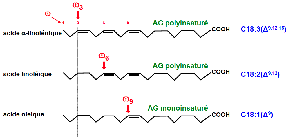 Pour arriver en oméga 6 (liaison Delta 12-13) tu dois absolument avoir la liaison Delta 9-10 avant. Tu ne peux pas prendre par exemple l'acide stéarique et lui coller direct une double liaison Delta 12-13 sans la 9-10 en avant de celle-ci. Donc tu auras forcément un AGPI, idem pour w3