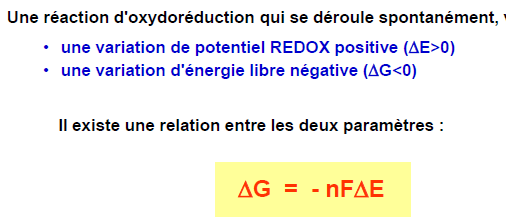 une augmentation du potentiel redox se caractérise par une deltaE > 0, donc un deltaG < 0, autrement dit une réaction endergonique