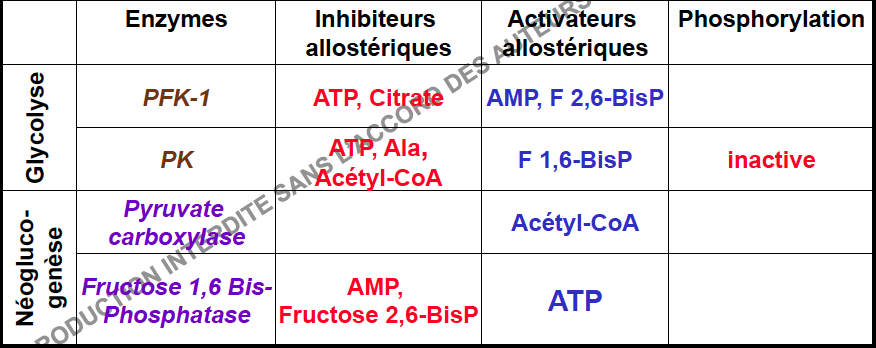 C'est encore une nouvelle remarque conservant le tableau bilan des régulation de la NGG et glycolyse : Diapo II poly 64.