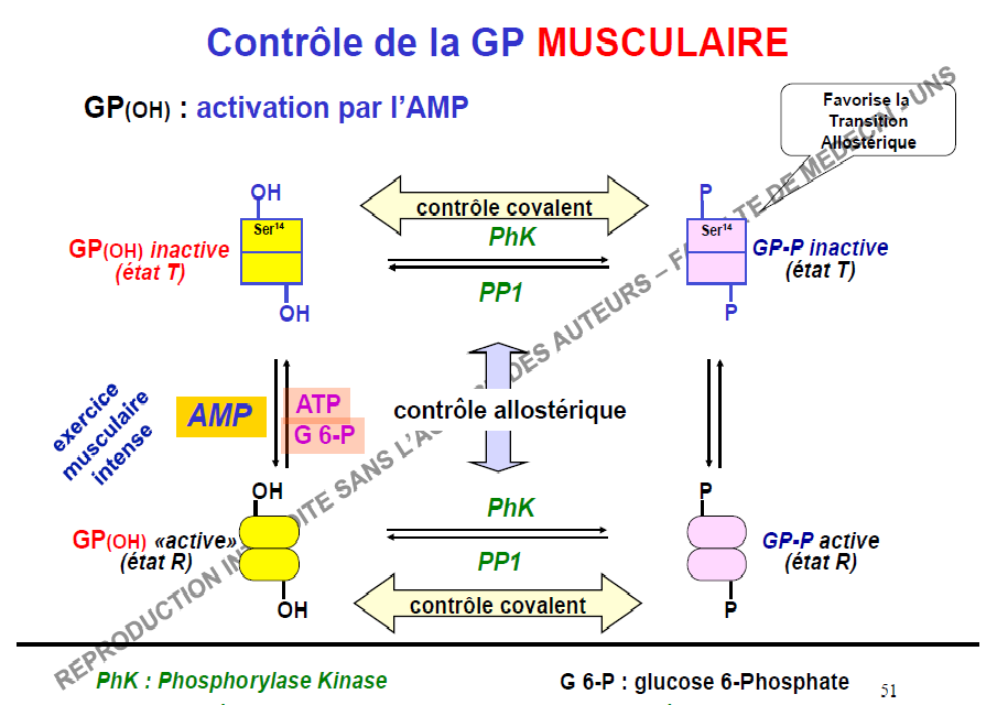 Jsuis pas trop d'accord, il peut y avoir phosphorylation ok, mais on passe de la forme T à la forme T, seul l'AMP pourra faire passer la Glycogène phosphorylase de l'état T à l'état R ... Non ? :confused:
