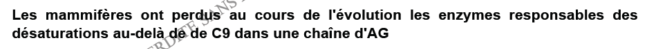 Guillaume.M a écrit:salut je me rajoute parce que ça ma choqué aussi , pour moi la delta 9 désaturase n'est PAS absente cher les mammifères ce sont les delta 6 , 3 , d'après ce que j'ai retenu du cours sur les lipides … vos avis please