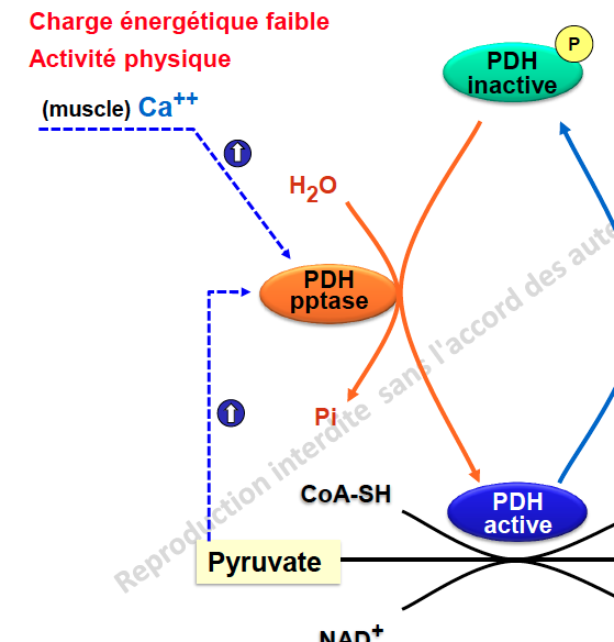 Compté vrai. Je vois pas ce que vient faire le pyruvate.. Je crois qu'il n'y a que le calcium qui active la PDH phosphatase. Le pyruvate agit seulement sur PDH kinase en l'inhibant..