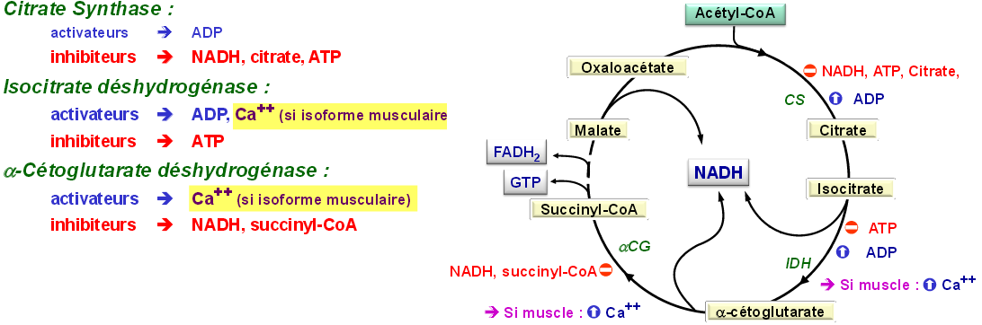 après globalement la vitesse du cycle est dictée par les rapports ADP/ATP et NAD+ / NADH + H+, mais pour les régulations enzyme par enzyme c'est plus précis et c'est les diapo que je viens de vous mettre