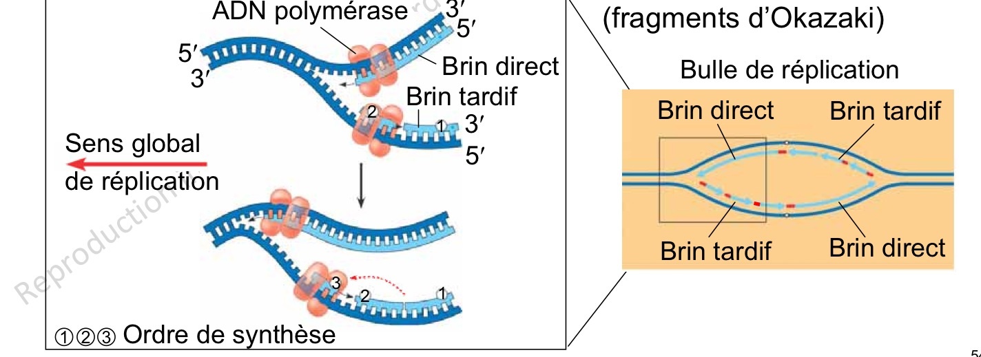 Alors faut savoir que la réplication va toujours se faire de 5' vers 3' que ça soit pour le brin direct ou le brin tardif.